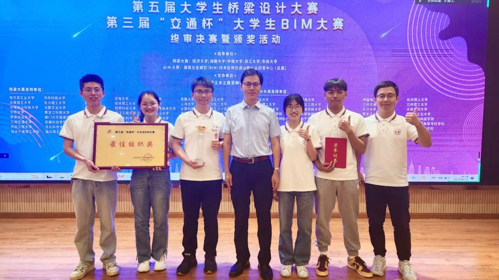 6月11日,由建筑信息模型(BIM)技术应用交通运输行业研发中心(云南)主办的第三届“交通杯”大学生BIM大赛决赛在上海举行,学院张恒龙教授、杜攀峰助理教授指导的本科生团队参赛作品《长沙县至平江县二级公路设计》荣获公路工程赛道一等奖,学院荣获最佳组织奖。