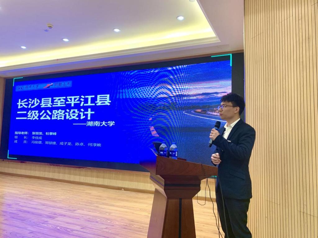在比赛现场,主答辩人李佳成同学向各位专家评委详细介绍了参赛作品,并回答了有关问题,得到了评委老师的一致好评。经过激烈对决,学院参赛团队成功斩获公路工程赛道一等奖。在备赛、参赛过程中,学院高度重视、精心组织,指导老师耐心指导、精心投入,团队成员团结协作、分工明确,利用公路工程设计BIM系统的软件技术完成了路线设计和路基路面设计与验算,基于公路工程设计BIM系统的平交口模型,在VISSIM中进行了平交口的仿真分析。