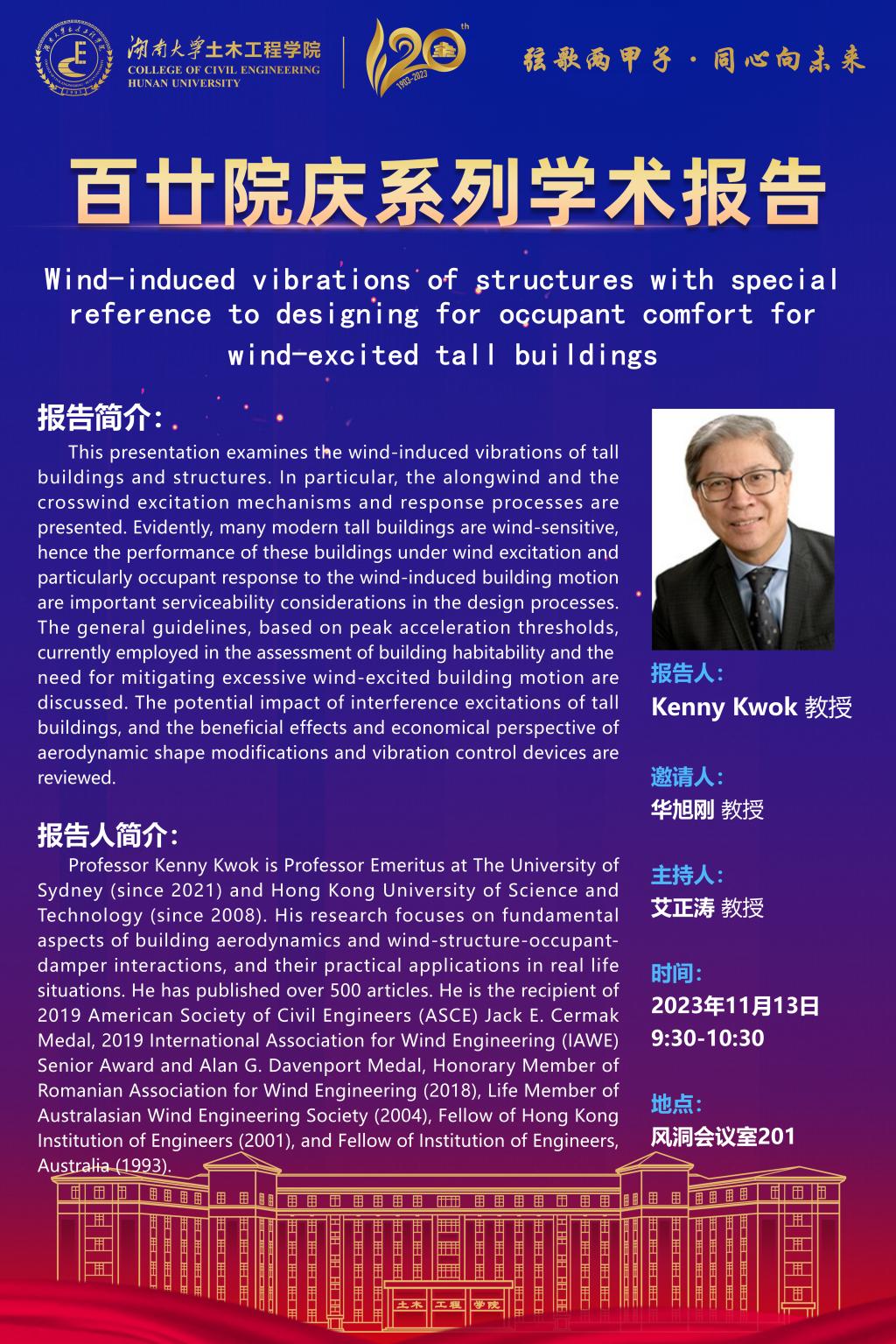 百廿院庆 学术活动|Kenny Kwok:Wind-induced vibrations of structures with special reference to designing for occupant comfort for wind-excited tall buildings