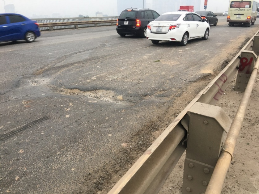 由于钢桥面的柔度很大,在车轮的反复碾压下,钢桥面沥青铺装频繁出现开裂、坑槽、推移等病害问题,这也是钢桥领域的通病。升龙大桥的钢桥面沥青铺装分别于1999年和2009年进行了全面翻修,但仍无济于事,2018年,大桥钢桥面沥青铺装再次严重破损,不得不将行车速度限制为20公里/小时,严重影响了行车舒适性和通行效率。