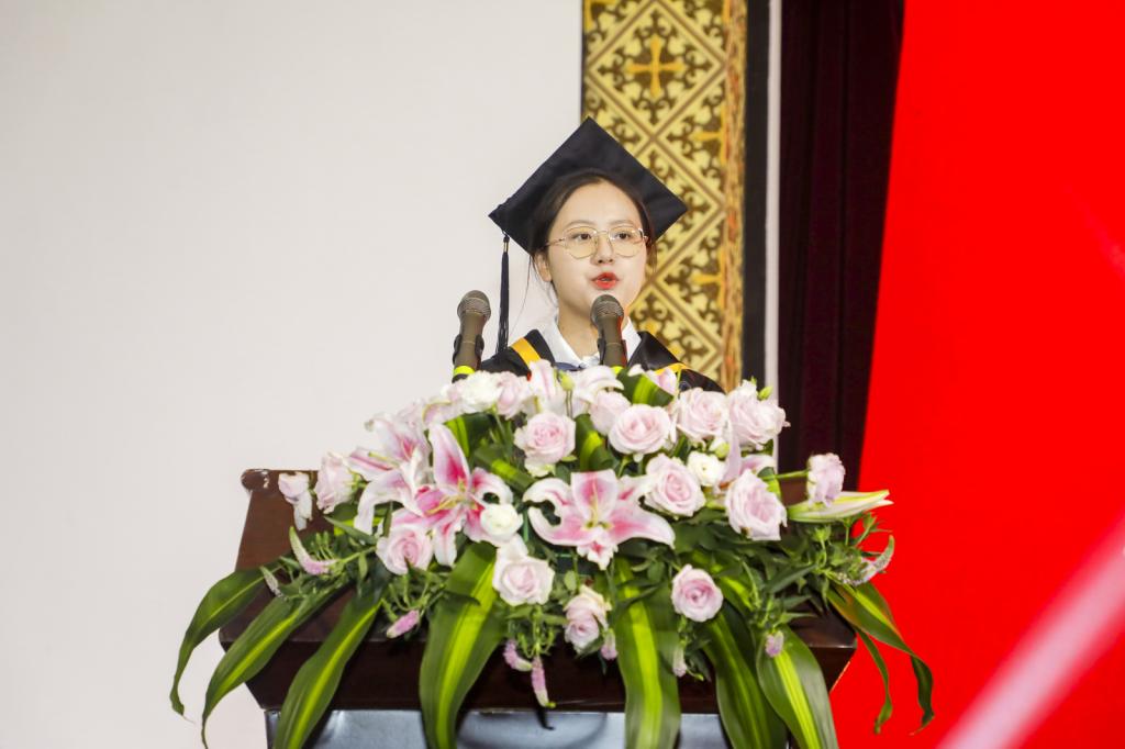 本科生毕业生代表王雨婷诉说了自己对母校的热爱与不舍,展示了自己对未来的自信与期待,并祝愿各位老师工作顺利、桃李天下、阖家幸福,祝愿毕业生同学以梦为马,前程似锦。