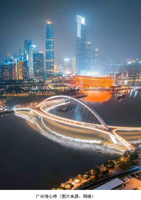 6月25日,位于广州中轴线核心地段的地标性建筑—海心桥正式投入运营。该桥是广州首座跨珠江人行桥,也是世界上跨度最大、宽度最宽的曲梁斜拱人行桥。大桥跨径198m,全长488m,主跨桥面宽15m,主拱高56m、倾角10°,主梁为曲线梁。大桥融入了丰富的岭南地域文化元素,造型优美。