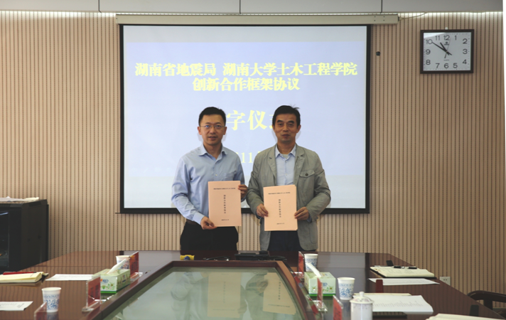 与湖南省地震局创新合作框架协议签署仪式在湖南省地震局举行。省地震局党组书记、局长燕为民主持仪式并致辞,院长邓露出席仪式并讲话。省地震局党组成员、局长助理王春华、土木学院副院长彭晋卿等出席活动。