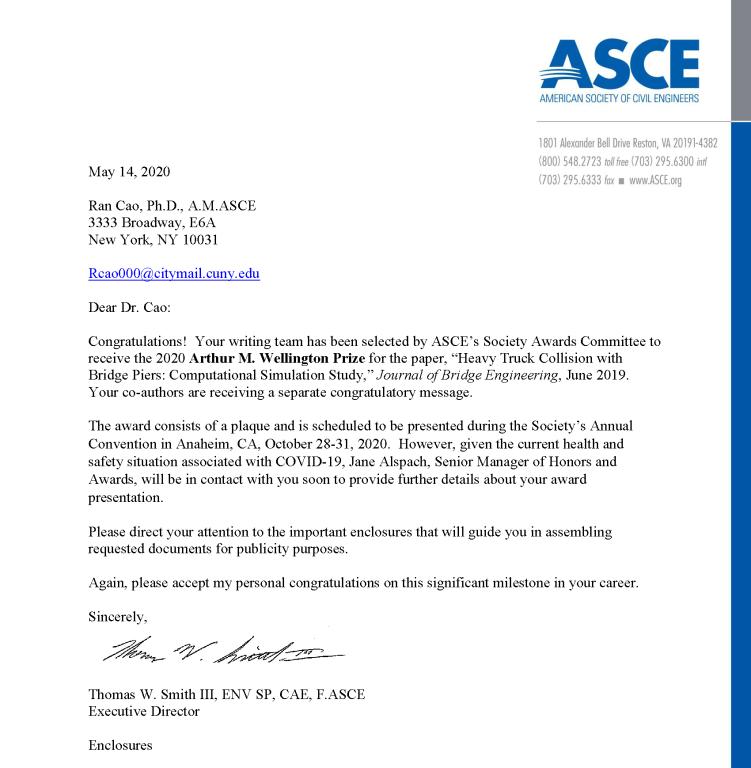 2011级本科生曹然以第一作者发表的SCI期刊论文“Heavy Truck Collision with Bridge Piers: Computational Simulation Study” 获得了ASCE 2020年“亚瑟M. 惠灵顿奖”。该奖项每年颁发给在世界土木交通工程领域有突出贡献的科研论文,涵盖海、陆、空三个领域,是ASCE所有科研奖项中历史最悠久,最具国际声望的学术成就奖之一。通过协会委员会提名、评选,每年仅有一篇论文获得此项殊荣。