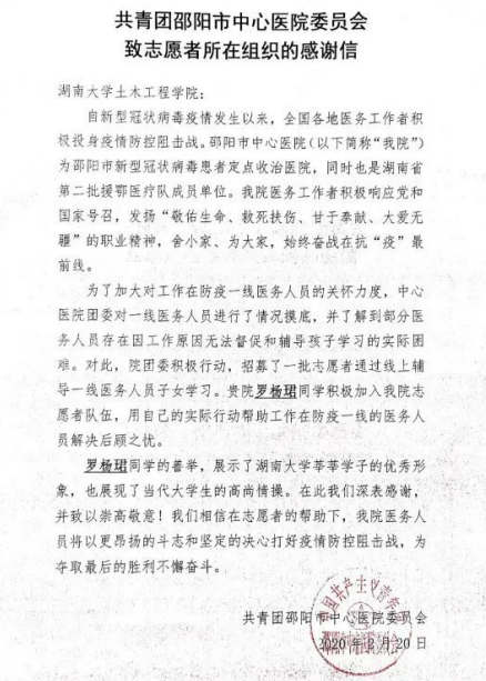 在抗击疫情特殊而又艰难的时期里,总有一束光,穿过阴霾,照亮生活。不久前,一封来自邵阳市中心医院的感谢信送达无码卡通