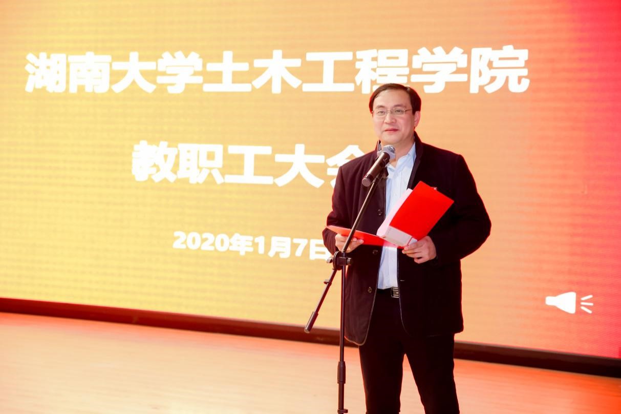 在教职工大会上,施周院长首先回顾了土木院2019年在学科建设、人才培养、科学研究、社会服务等方面所取得的成就。并寄语学院教职工在2020年只争朝夕,不负韶华,为学院的建设发展做出新的贡献!最后为全体教职工送上美好的祝福。