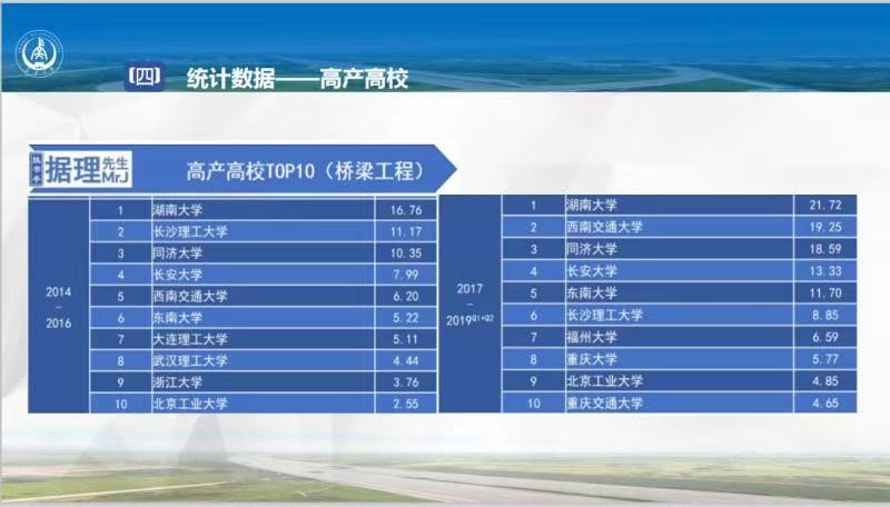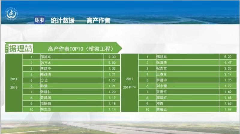 该统计数据表明:近5年来,我校在校定重点期刊《中国公路学报》桥梁工程方向发文量稳居第一。我校周绪红院士、陈政清院士、邵旭东教授、方志教授、邓露教授入选高产作者TOP10榜单,榜单占比过半,表明我校桥梁工程学科多年来持续产出高质量研究成果,在国内具有很好的学术影响力和声誉。
