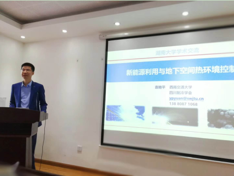 首先由李念平教授致欢迎辞,诚挚欢迎袁艳平教授的到来并向在座的各位提出要求,希望大家认真听,多提问。接着由袁艳平教授进行学术报告会。袁艳平教授从六个方面讲解本次报告的内容。首先,袁艳平教授介绍了地下空间热湿环境控制的必要性与研究前景,并向大家介绍了低品位能源、可再生能源与相变储能的有关知识。其次,袁艳平教授从地下空间能源系统的特殊性角度,详细的汇报了团队在地下空间能源应用的最新成果。袁艳平教授将应用形式分为单一研究形式与集成应用形式。在单一应用形式中,袁艳平教授向大家分别介绍了太阳能光伏系统、地埋管系统、相变储能系统在地下空间应用的最新研究成果;接着又介绍了将以上三种系统两两组合在地下空间集成应用。最后袁艳平教授对地下空间能源系统提出了展望,引发大家的思考。在袁艳平教授汇报结束后,大家对袁教授的精彩汇报纷纷送上热烈的掌声。接下来的问答环节,老师和同学们纷纷就自己感兴趣的方面提出问题,袁艳平教授耐心的为大家一一做出了解答。