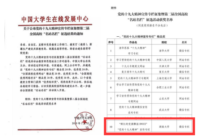 公众号“鲜红的党旗飘扬HNUCE”“党的十九大精神”宣传专栏荣获“党的十九大精神宣传专栏”精品奖。