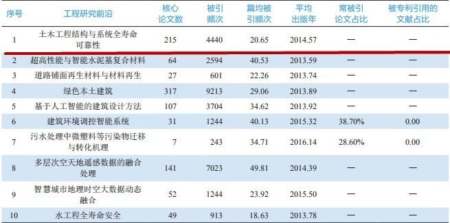 本次发布的《全球工程前沿2018》报告中列出了土木、水利和建筑工程领域 Top10 工程研究前沿(见表3),涉及到结构工程、土木建筑材料、道路与铁路工程、建筑学、暖通空调、市政工程、测绘工程和水利工程等学科方向,其中,“土木工程结构与系统全寿命可靠性”位列本领域最热门研究前沿。