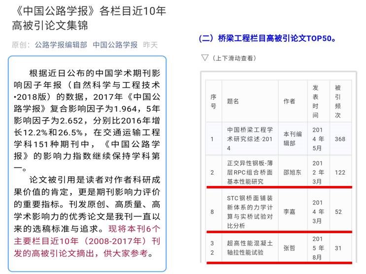 图1. 邵旭东教授团队三篇论文位列《中国公路学报》“桥梁工程栏目”近十年高被引论文