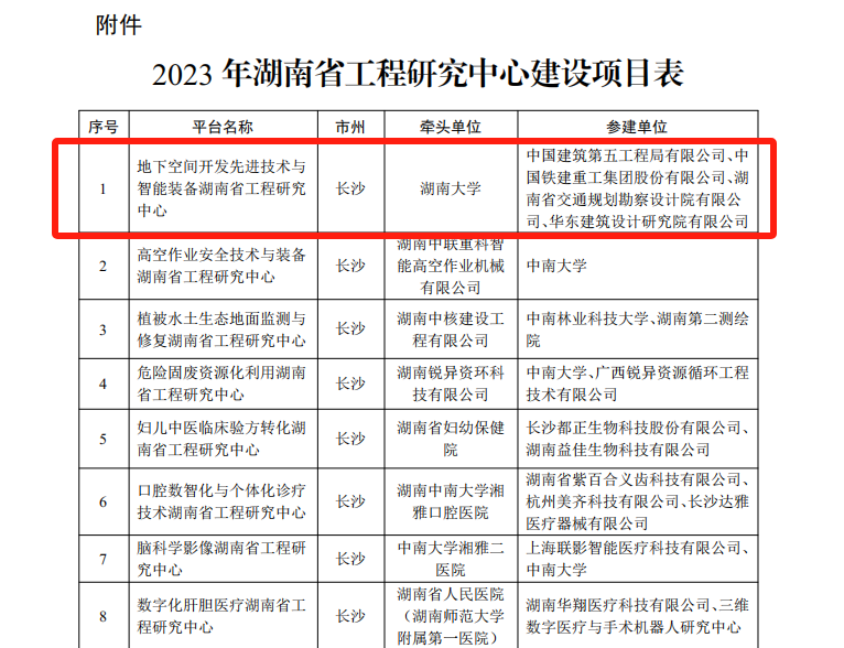 牵头申报,中国建筑第五工程局有限公司、中国铁建重工集团股份有限公司、湖南省交通规划勘察设计院有限公司、华东建筑设计研究院有限公司联合建设的地下空间开发先进技术与智能装备湖南省工程研究中心获批立项,无码卡通