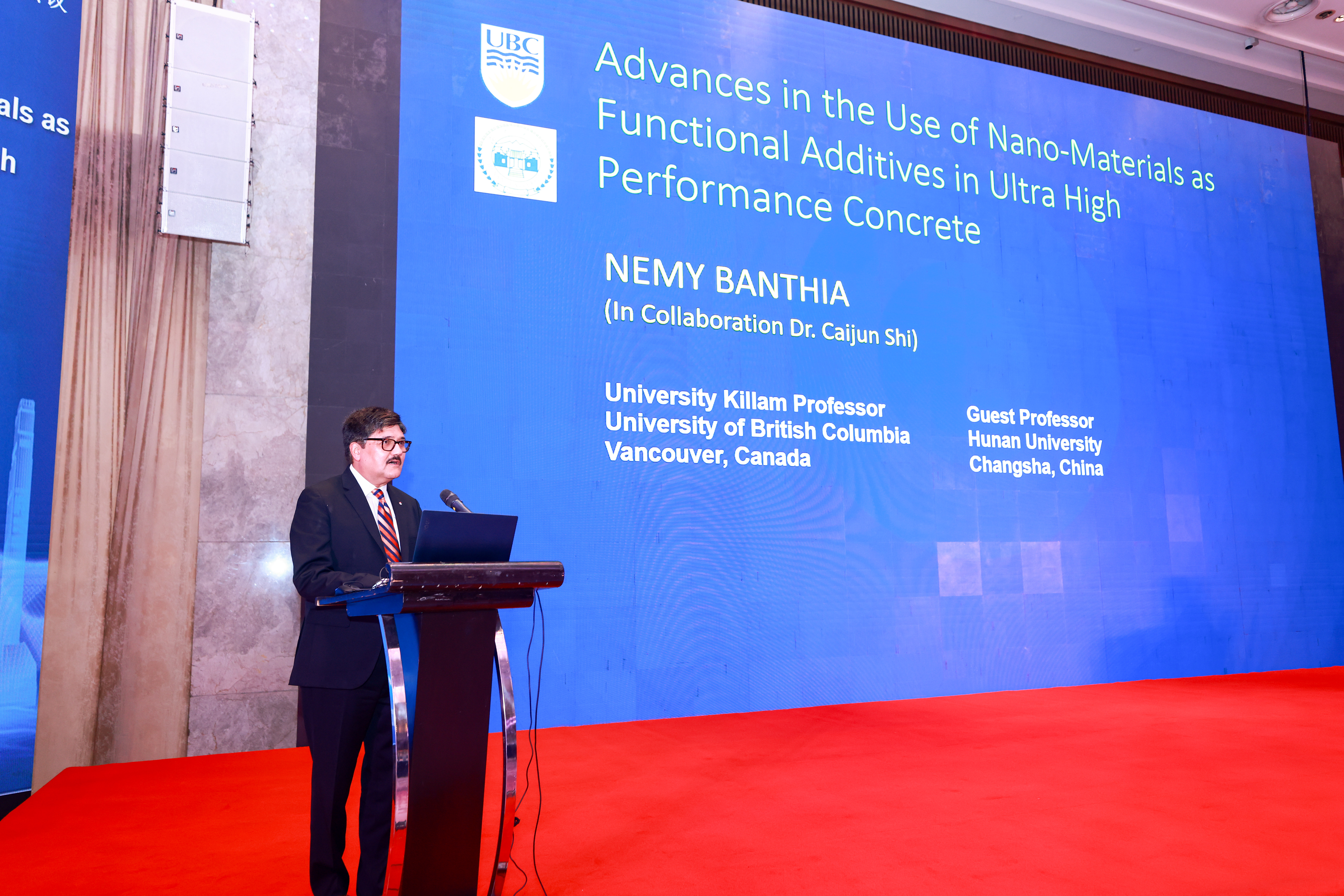 Nemkumar Banthia院士作题为《Advances in the Use of Nano-Materials as Functional Additives in Ultra High Performance Concrete (UHPC)》的主题报告。