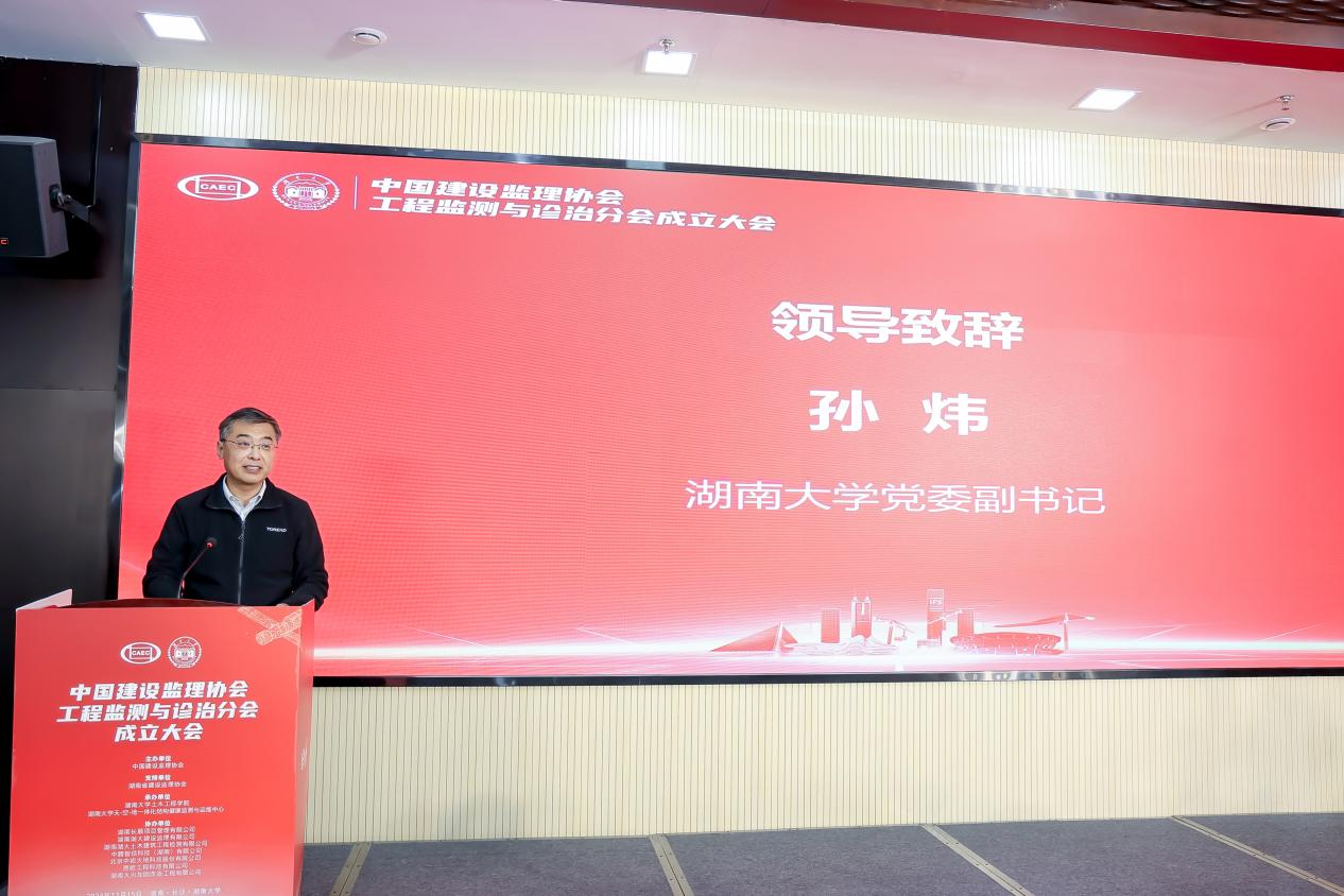 孙炜在大会上致辞,期望分会能够充分发挥桥梁和纽带的作用,加强与国内外知名高校和头部企业的交流与合作,推动工程监测与诊治行业高质量发展。