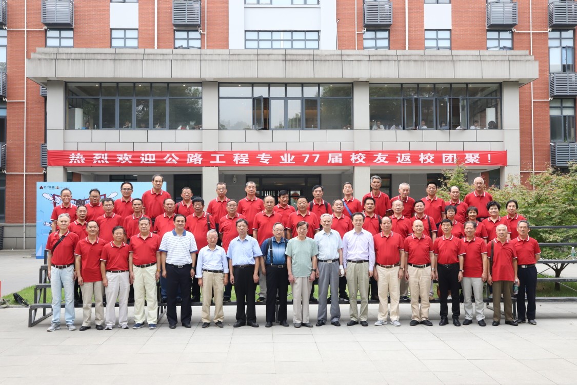 院长施周,党委副书记颜李,道路与交通工程系主任颜可珍,四十余名77届公路专业校友及当时的任课教师同聚学院报告厅,共叙师生同窗情。