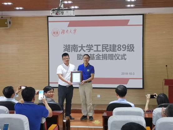 土木系工民建专业89级校友助学基金(简称“湖大工民建89级助学基金”)成立,土木院成为拥有“肖春源奖助学金”、“皓芬奖学金”、“82级给排水助学金”、“92级给排水助学金”、“土木83级奖助学金”、“公路78级奖学金”、“80级公路助学金”、“公路90级基金”、“交通土建92级共识奖学金”、“98级建工专业奖助学金”、"98级给水专业奖学金”“碧水源奖助学金”“廖宏奖学金””湖大工民建89级助学基金”、“湖大暖通基金”等校友返校设立的奖助金最多学院之一。